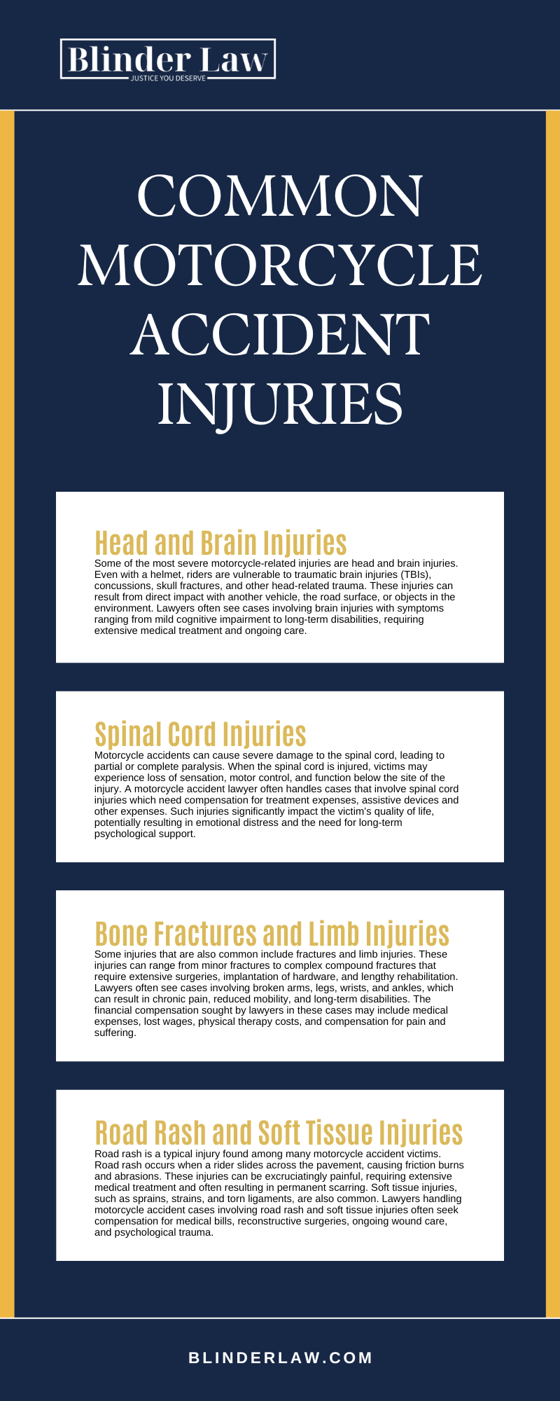 Motorcycle accidents can have life-altering consequences for riders, leading to severe injuries and substantial financial burdens. Lawyers who specialize in motorcycle accident cases often encounter four common types of injuries: head and brain injuries, spinal cord injuries, bone fractures and limb injuries, and road rash and soft tissue injuries. These injuries may result in long-term medical treatment, rehabilitation, and ongoing care, impacting the victim’s physical, emotional, and financial well-being. If you or a loved one has been injured in a motorcycle accident, do not wait to contact a New Brunswick motorcycle accident lawyer like one from Blinder Law to receive urgent legal counsel.
