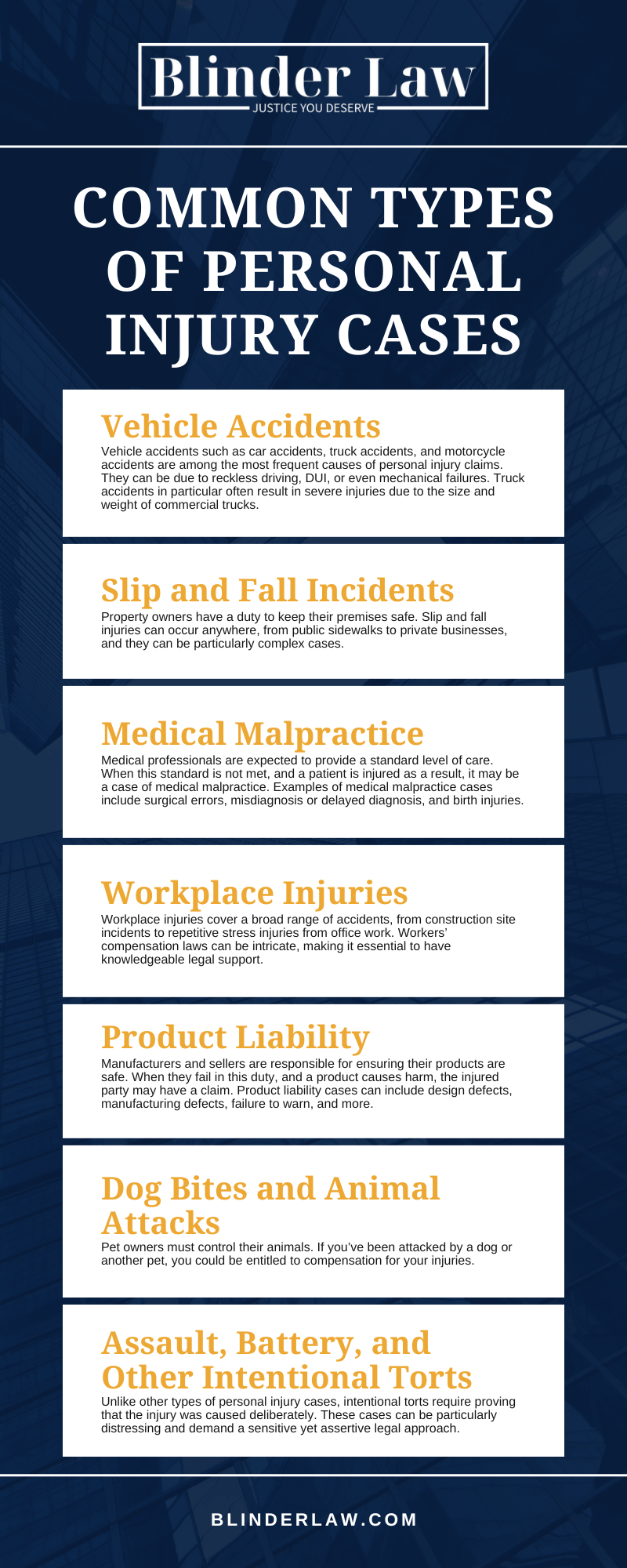 Understanding the various types of personal injury cases is crucial for anyone who may have been harmed due to someone else’s negligence. at Blinder Law, we’ve seen firsthand how an injury can upend your life. Whether it’s grappling with medical bills, lost wages, or the emotional toll of an accident, our experienced team is here to guide you through the legal process. Below, we detail common personal injury cases and emphasize the importance of seeking the right legal representation.
